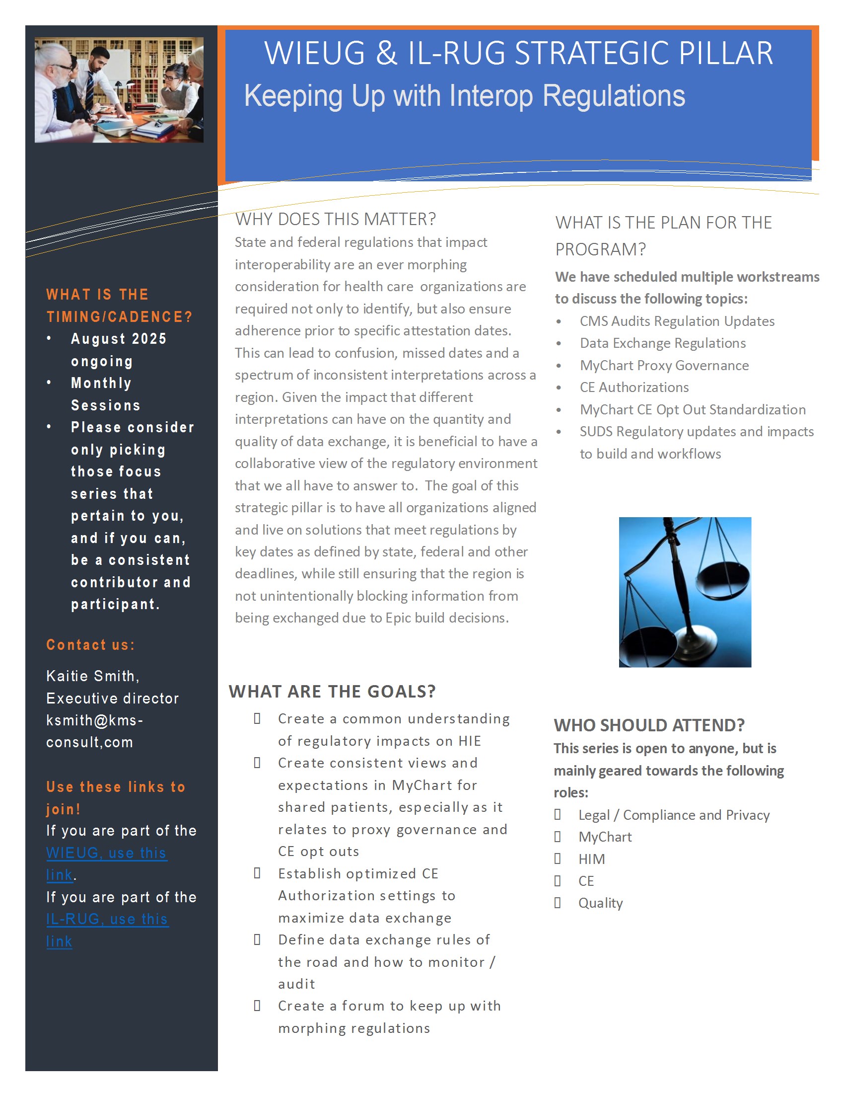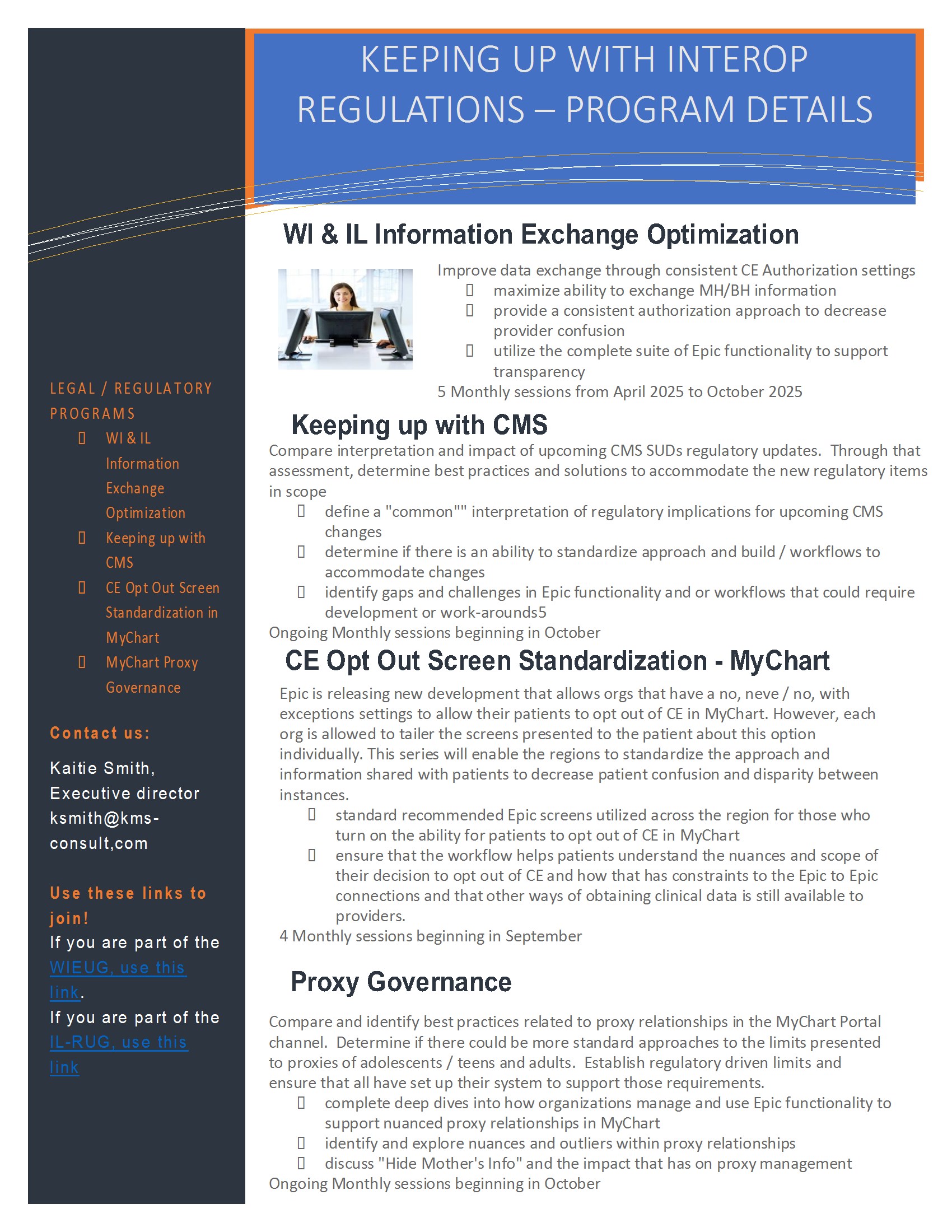 The leadership teams were unanimous! Keeping up with regulations, especially those that have an impact on the ability for health care organizations to effectively and efficiently exchange patient data to support treatment and continuity of care remains the number one priority of Wisconsin Epic organizations. See below for details of the program, links to session documents and notes and check out the WIEUG calendar and registration form to participate in these important initiatives!